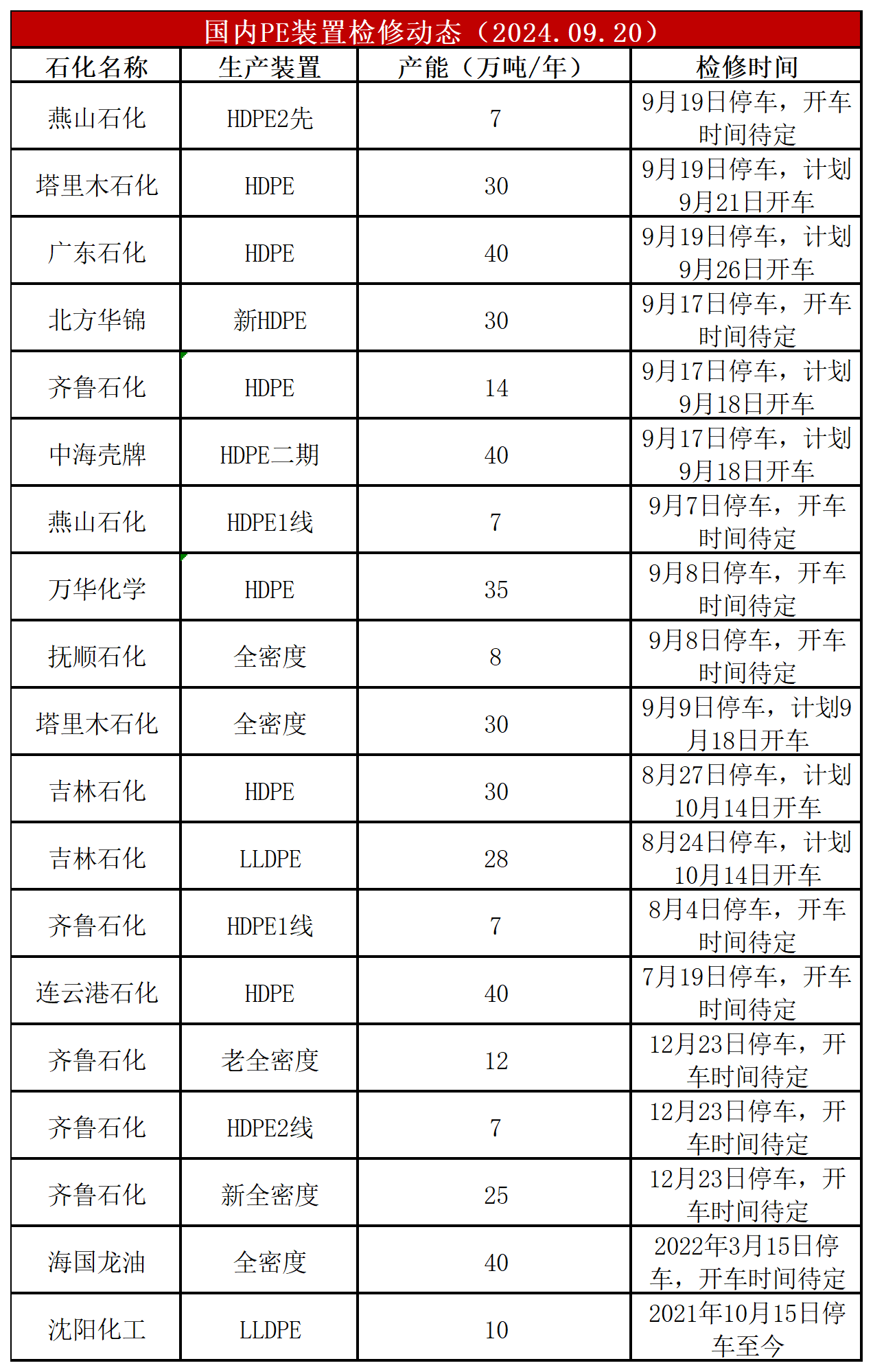 简评:PE装置齐鲁石化LDPE开车,塔里木石化HDPE、燕山石化HDPE2线、广东石化HDPE停车,开工负荷下降至88%左右,比上周+0%,较去年同期-2%。PE装置塔里木石化HDPE计划开车,PE开工负荷预计变化不大。